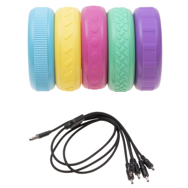 Die Leucht-Scheiben sind akkubetrieben und lassen sich über das mitgelieferte USB-Kabel einfach aufladen. Dank der Aufteilung des Kabels auf insgesamt 5 Stecker-Stränge schließen Sie bei Bedarf alle 5 Scheiben gleichzeitig an.