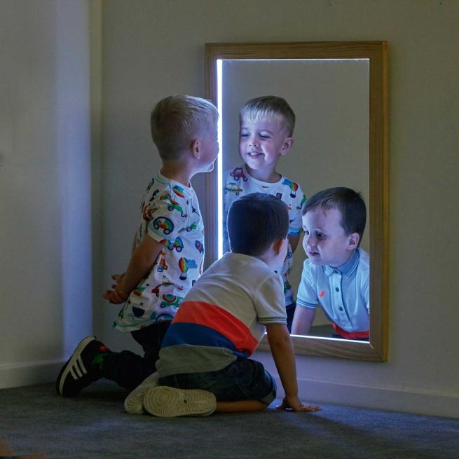 Der große rechteckige Spiegel ist eine echte Forschungsstation für Kinder, die ihre eigenen Bewegungen und Reflexionen entdecken wollen. Sie betätigen den umseitigen Schalter und schon leuchtet der Spiegel angenehm in weißem Licht. In dieser Atmosphäre beobachten die Kinder sich selbst und ihre Umgebung noch lieber. Schattenbewegungen faszinieren besonders Kleinkinder. Komplett montiert. Ohne Montagematerial und ohne 3 AA-Batterien.