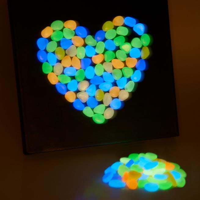 Kunstwerke mit tollen Farbeffekten gestalten Ihre Kinder mit den je 1,5 cm großen Kieselsteinen. Die sanfte Pastellfärbung lädt sich durch Sonnenlicht oder eine Lampe auf und glimmt im Dunkeln noch für eine Weile nach. Im Handumdrehen machen die Kinder schöne Formen oder tolle Bilder aus den Leuchtkieseln. Kleben Sie die Steine gemeinsam z. B. auf Glas, Holz, Karton oder Keilrahmen.