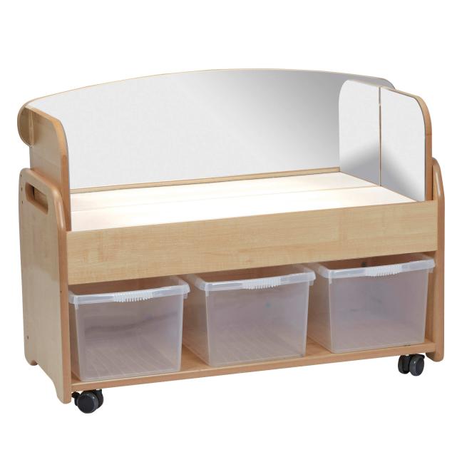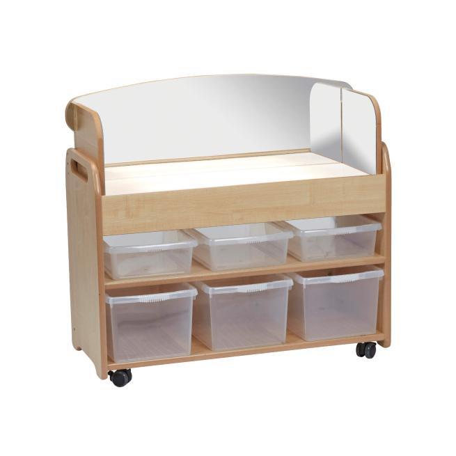 Optional ist das Leuchtmobil mit einem abnehmbarem Spiegel bestellbar (bitte wählen). Im montierten Zustand umrahmt der Spiegel die Leuchtfläche an beiden Schmalseiten sowie einer Längsseite und fasziniert durch aufregende Lichtbrechungen sowie spannende visuelle Effekte. Er ist als Sicherheitsspiegel ausgeführt und besteht aus Kunststoff. Für das Lernen und Experimentieren in kleinen Gruppen nehmen Sie den Spiegel schnell und einfach ab, sodass der Leuchtwagen wieder von allen Seiten zugänglich ist.Bitte beachten Sie: Der optionale Sicherheitsspiegel besteht aus Kunststoff. Bei spitzen Gegenständen ist Vorsicht geboten, da diese Kratzer auf dem Kunststoff verursachen können.
