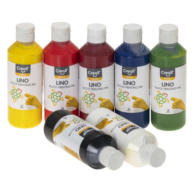 9 verschiedene Farben und eine Vielzahl an Verwendungsmöglichkeiten. Diese Linol-Druckfarbe basiert auf Wasser und ist damit unbedenklich für den kindlichen Gebrauch. Verwenden Sie die Farbe direkt aus der Flasche und setzen Sie sie für verschiedene Drucktechniken ein. Die hohe Farbbrillanz kommt auf Pappe oder Holz ebenso zur Geltung wie auf Gummi oder Linoleum. Die Farben sind auch untereinander gut zu mischen und bleiben lange geschmeidig.