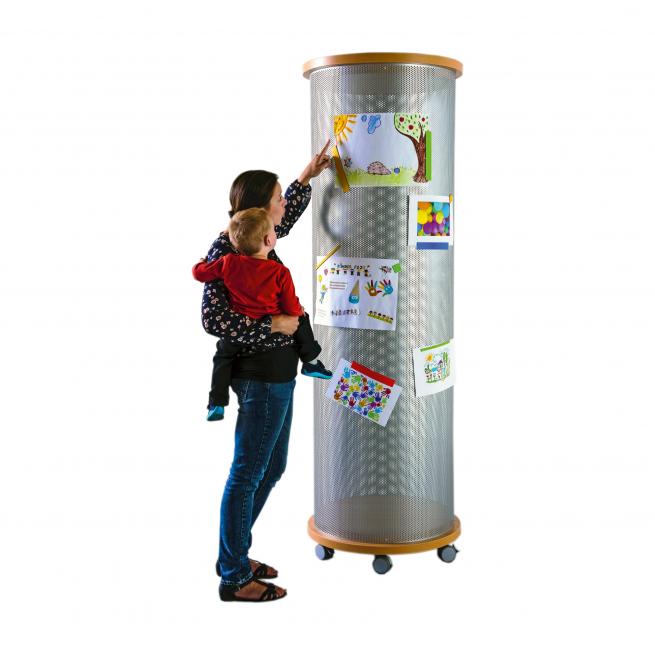 Ob Eingangsbereich, Aula, Gruppen- oder Klassenraum, an der magnethaftenden Litfaßsäule präsentieren Sie wichtige Mitteilungen oder Kunstwerke. Dank der fünf Rollen schieben Sie die Säule leicht an den gewünschten Ort. Zwei arretierbare Rollen geben festen Stand. Im trendigen Materialmix aus Lochblech und Holz. Farben wählbar.