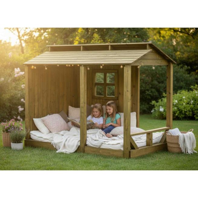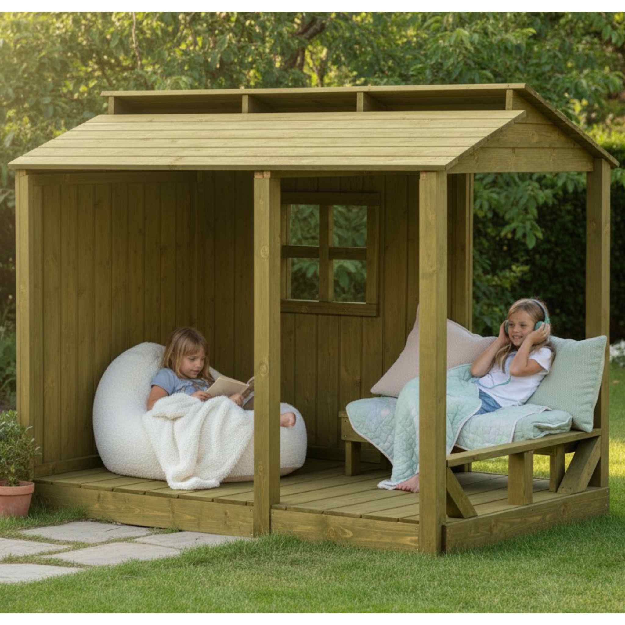 Das Lounge-Häuschen bietet Kindern einen geschützten Wohlfühlraum für draußen. Die teilweise geschlossene Bauform schafft Geborgenheit, die offene Front bringt Licht in den Innenraum und unterstützt eine freundliche Atmosphäre beim Spielen, Lesen, Kuscheln und Entspannen. Das Häuschen passt in Kindergarten, Krippe, Schule, Therapieeinrichtung und in den privaten Garten. Die Konstruktion aus kesseldruckimprägniertem Kiefernholz punktet mit robuster Verarbeitung, hoher Widerstandskraft gegen Witterung, Feuchtigkeit, Pilzbefall und Insekten sowie einer hochwertigen Optik durch Nut-&-Feder-Wände. Die Kesseldruckimprägnierung ist schwermetallfrei sowie borfrei und sicher für Kinder.