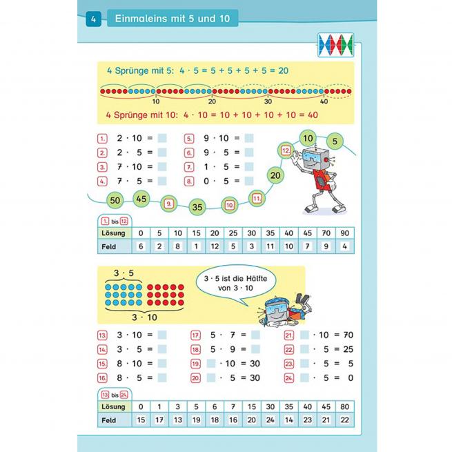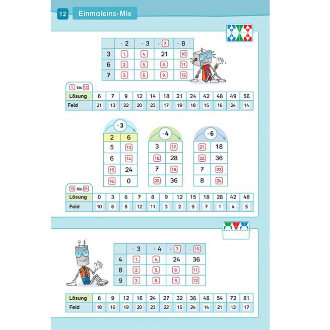 Dabei werden auch vielfältige Hilfen angeboten, schwierige Aufgaben aus bekannten abzuleiten. Das Thema „Kleines Einmaleins” wird im Mathematikunterricht des 2. Schuljahres behandelt; das Heft ist aber auch im 3. und 4. Schuljahr gut einsetzbar, um evtl. Defizite auszugleichen.