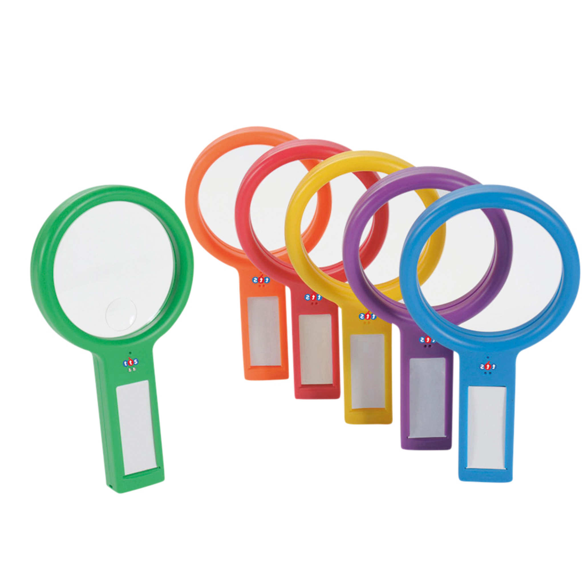 Die fröhlich-bunten Lupen mit Aufnahmefunktion kommen im praktischen 6er-Set und haben es faustdick hinter den Gläsern: Sie vergrößern sowohl 2- als auch 4-fach und verfügen als besonderes Extra über eine Sprachaufnahmefunktion für Audiospuren bis 30 Sekunden Länge. Und das funktioniert ganz simpel über einfachen Tastendruck. So halten die Kinder ihre persönlichen Eindrücke und Kommentare beim Erkunden mit der Lupe direkt fest und hören sich die Aufnahme später wieder an. Eine tolle Motivation, um eigenständig auf spannende Entdeckungstour durch Außenbereich und Garten zu gehen.