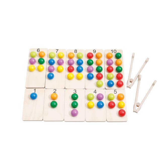 Mithilfe der Holzzangen sortieren die Kinder die verschiedenfarbigen Kugeln in die rechteckigen, quadratischen oder dreieckigen Spielbretter. Sie schichten die Murmeln zu kleinen Pyramiden auf oder platzieren sie auf den mit Ziffern beschrifteten und einer jeweils passenden Anzahl Mulden versehenen Täfelchen. Auf diese Weise lernen die Kinder erste Zahlzeichen bzw. Zahlen kennen und entwickeln ein Verständnis für die somit bezeichneten Mengen. Dabei führen die Kinder auch kleine Rechenoperationen durch, wie Additionen und Subtraktionen. Mengen und Teilmengen lassen sich dank der unterschiedlich gefärbten Kugeln hervorragend nachvollziehbar darstellen. So macht der Einstieg in die Mathematik richtig Laune!Das intensive Bespielen des Sets regt die Kinder auch zu gemeinsamen Aktionen und zum Austausch untereinander an. Die Kinder sprechen über ihr Handeln, nutzen Zahlwörter oder die Namen von Farben. So lernen sie ebenso auf einer sprachlichen Ebene.