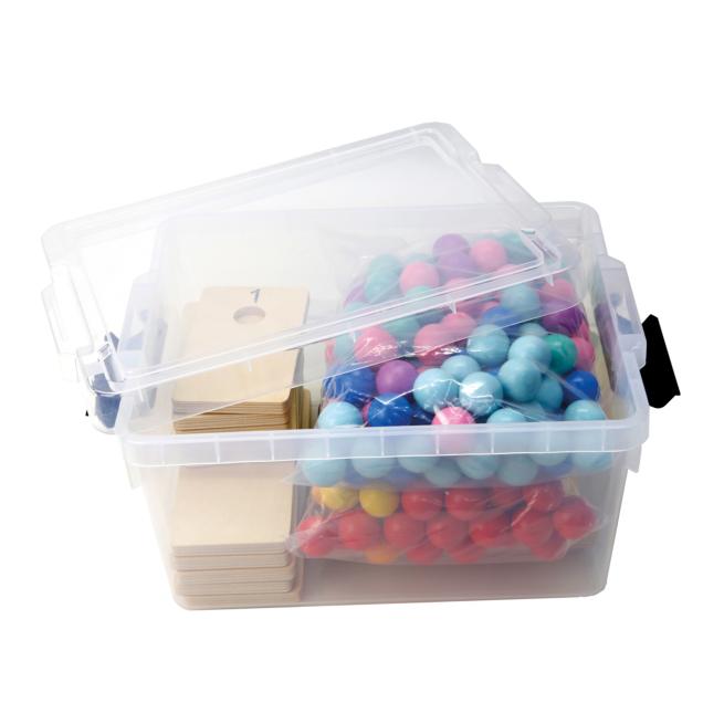 250 Holzkugeln Ø 3 cm (in insgesamt 10 Farben: Rot, Orange, Gelb, Hellgrün, Dunkelgrün, Hellblau, Dunkelblau, Türkis, Rosa, Lila)10 hölzerne Legebrettchen mit den Zahlen von 1 bis 10