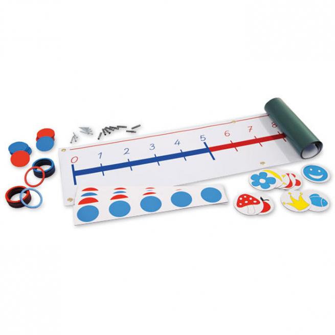 Dank des umfangreichen Materials veranschaulichen Sie Rechenoperationen: Sie verdecken Zahlen mit den Symbol- und Wendeplättchen und markieren mit Wenderingen. Beschreibbar ist der Zahlenstrahl mit abwischbaren Stiften (z. B. Whiteboard-Markern, nicht im Lieferumfang enthalten).