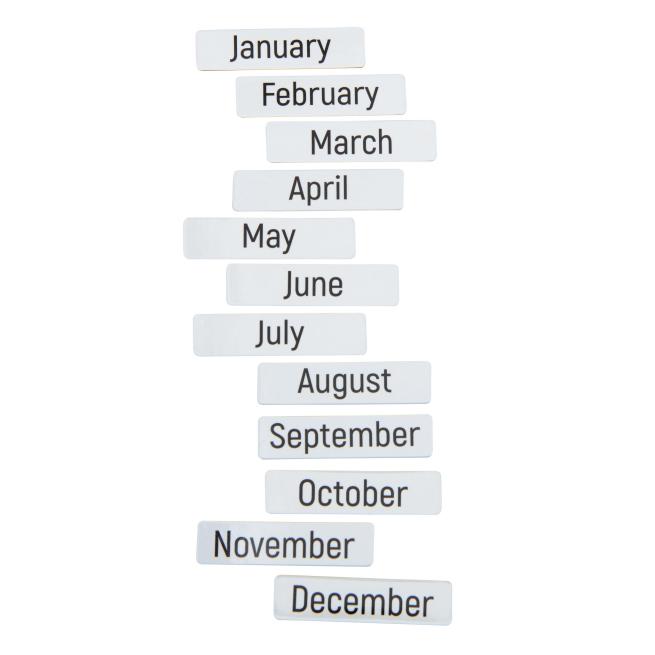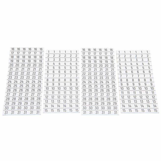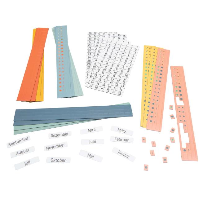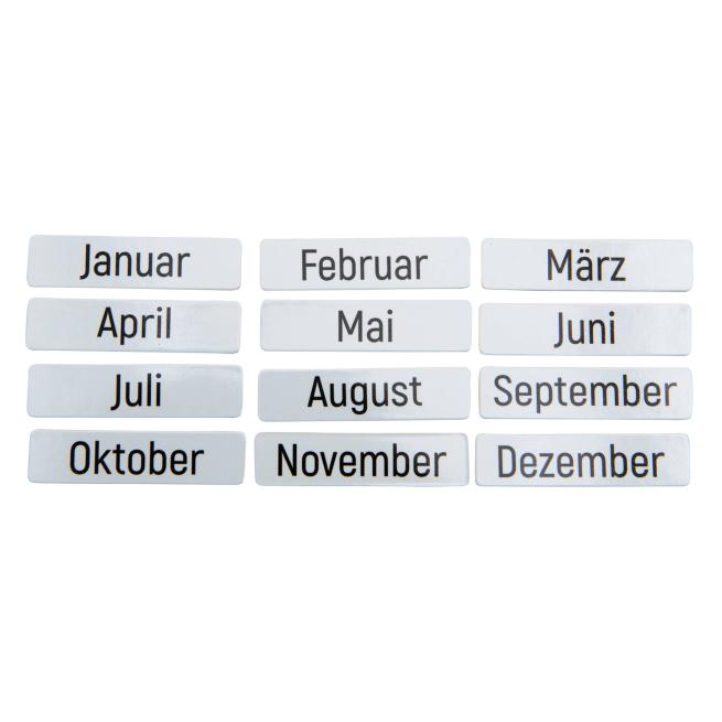 je 12 Zahlen 1 bis 31, ca. 1,8 x 1,8 cm12 Monate, 6 x 1,5 cm (beidseitig bedruckt, Deutsch und Englisch)