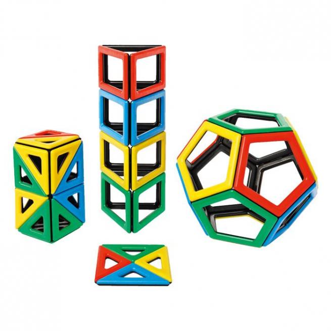 Aus einzelnen Bauteilen entstehen geometrische Formen, aus flächigen Netzen entstehen dreidimensionale Gebilde – kinderleicht! Die Bauteile haften magnetisch aneinander. So entstehen im Handumdrehen bunte, symmetrische Körper.