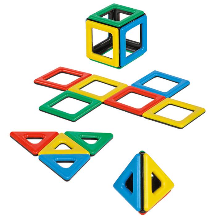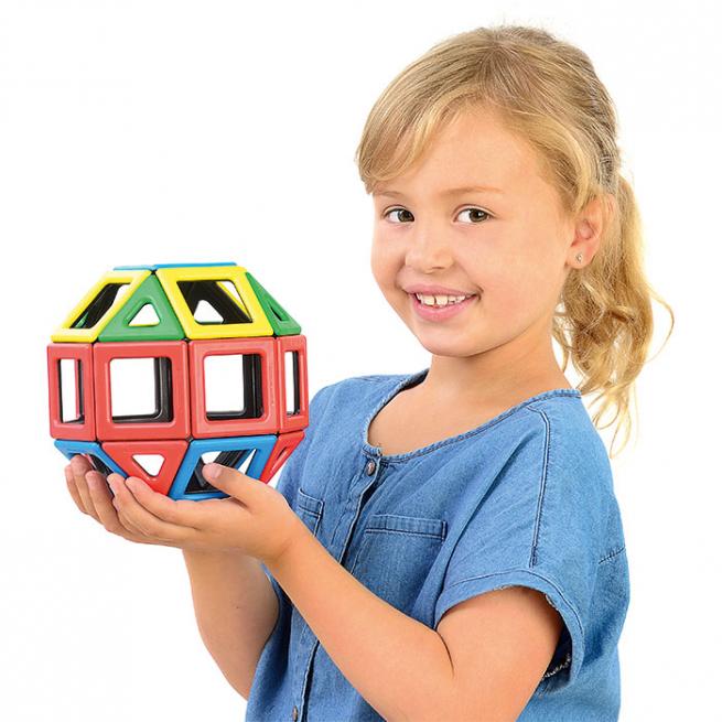 Aus einzelnen Bauteilen entstehen geometrische Formen, aus flächigen Netzen entstehen dreidimensionale Gebilde – kinderleicht! Die Bauteile haften magnetisch aneinander. So entstehen im Handumdrehen bunte, symmetrische Körper.