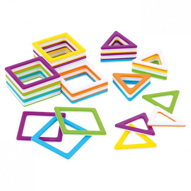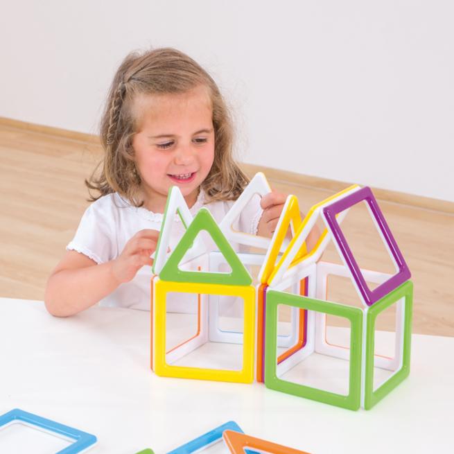 Die 36 Elemente haften einfach durch Magnetkraft aneinander. So entstehen aus Quadraten und Dreiecken im Handumdrehen dreidimensionale Bauwerke. Netze legen, zu Körpern aufrichten, wieder entfalten – alles klappt ganz leicht, denn die Magnetverbindungen wirken wie Scharniere. Die extragroßen Bauteile mit abgerundeten Kanten sind ideal für Kinderhände. Altersempfehlung: ab 3 Jahren Material: Kunststoff Quadrat: 12 x 12 cm