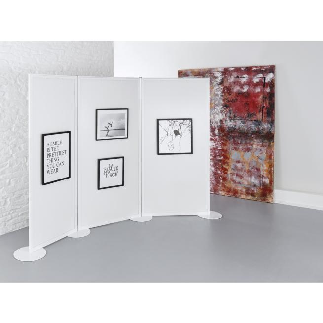Sie erhalten die Ausstellungswand mit einer Füllplatte aus magnetischem Stahlblech und einem einfassenden Aluminiumrahmen. Die Wand besitzt beidseitig eine Aluminiumschiene (Galerieleiste) samt Hängevorrichtung aus fast unsichtbaren Nylonschnüren, dank der Sie Kunstwerke und andere passende Ausstellungsobjekte bis zu einem Gewicht von 10 kg sicher befestigen und überzeugend präsentieren. Alternativ befestigen Sie geeignete Objekte, wie Planmaterial oder Zeichnungen, auch mithilfe von Magneten (nicht im Lieferumfang enthalten).