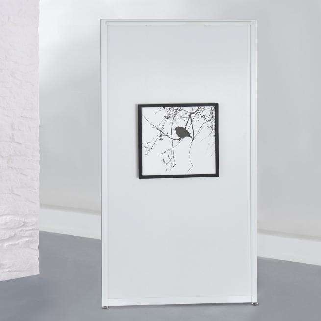 Sie erhalten die Ausstellungswand mit einer Füllplatte aus magnetischem Stahlblech und einem einfassenden Aluminiumrahmen. Die Wand besitzt beidseitig eine Aluminiumschiene (Galerieleiste) samt Hängevorrichtung aus fast unsichtbaren Nylonschnüren, dank der Sie Kunstwerke und andere passende Ausstellungsobjekte bis zu einem Gewicht von 10 kg sicher befestigen und überzeugend präsentieren. Alternativ befestigen Sie geeignete Objekte, wie Planmaterial oder Zeichnungen, auch mithilfe von Magneten (nicht im Lieferumfang enthalten).