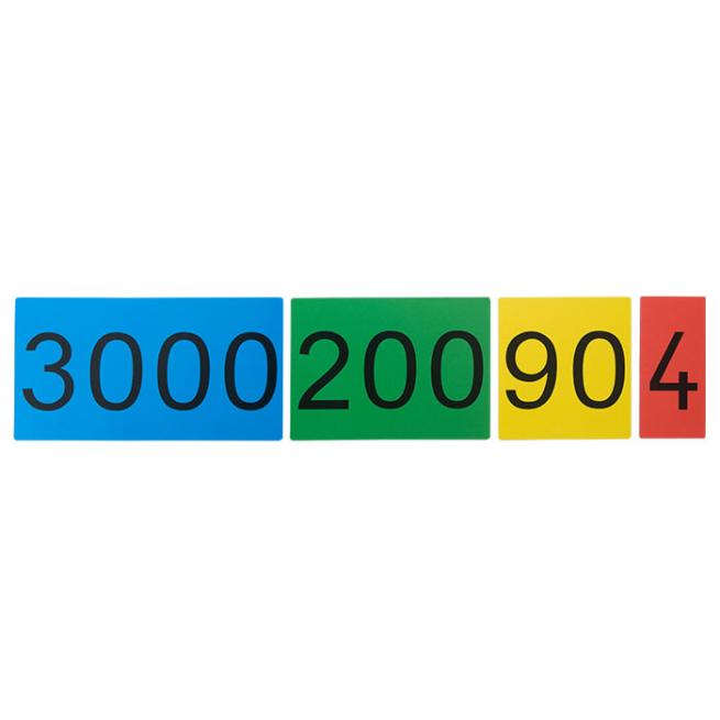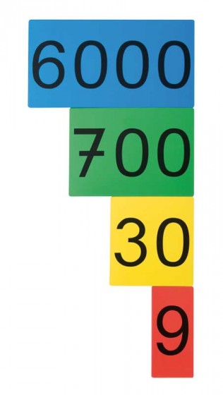 Von 0 bis 9.999 lassen sich alle Zahlen darstellen. Karten mit Einern, Zehnern, Hundertern und Tausendern sind von 0 bis 9 vorhanden und mit unterschiedlichen Farben versehen. Die Farben entsprechen denen des herkömmlichen Stellenwertmaterials.
