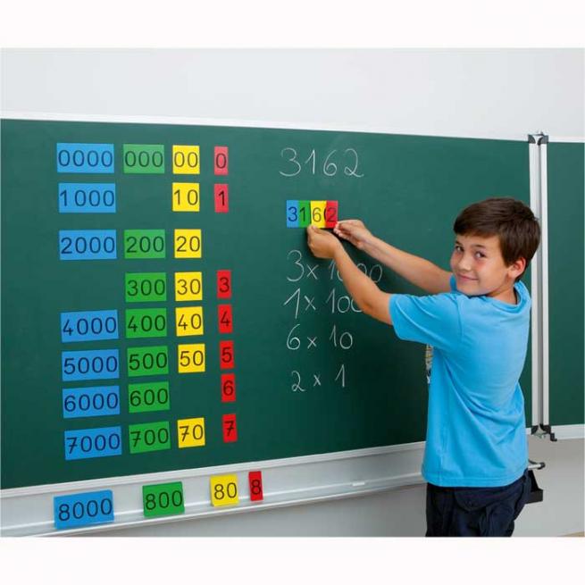 40 farbige Magnetkarten ermöglichen den Schülern das Erfassen des Stellenwertsystems.