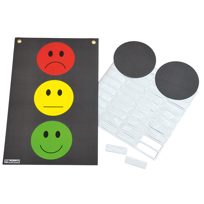 Mit der magnetischen Verhaltensampel funktioniert das ganz einfach an der Tafel. Die drei verschiedenen Gesichter auf den bekannten Ampelfarben deuten Ihre Schüler sofort.