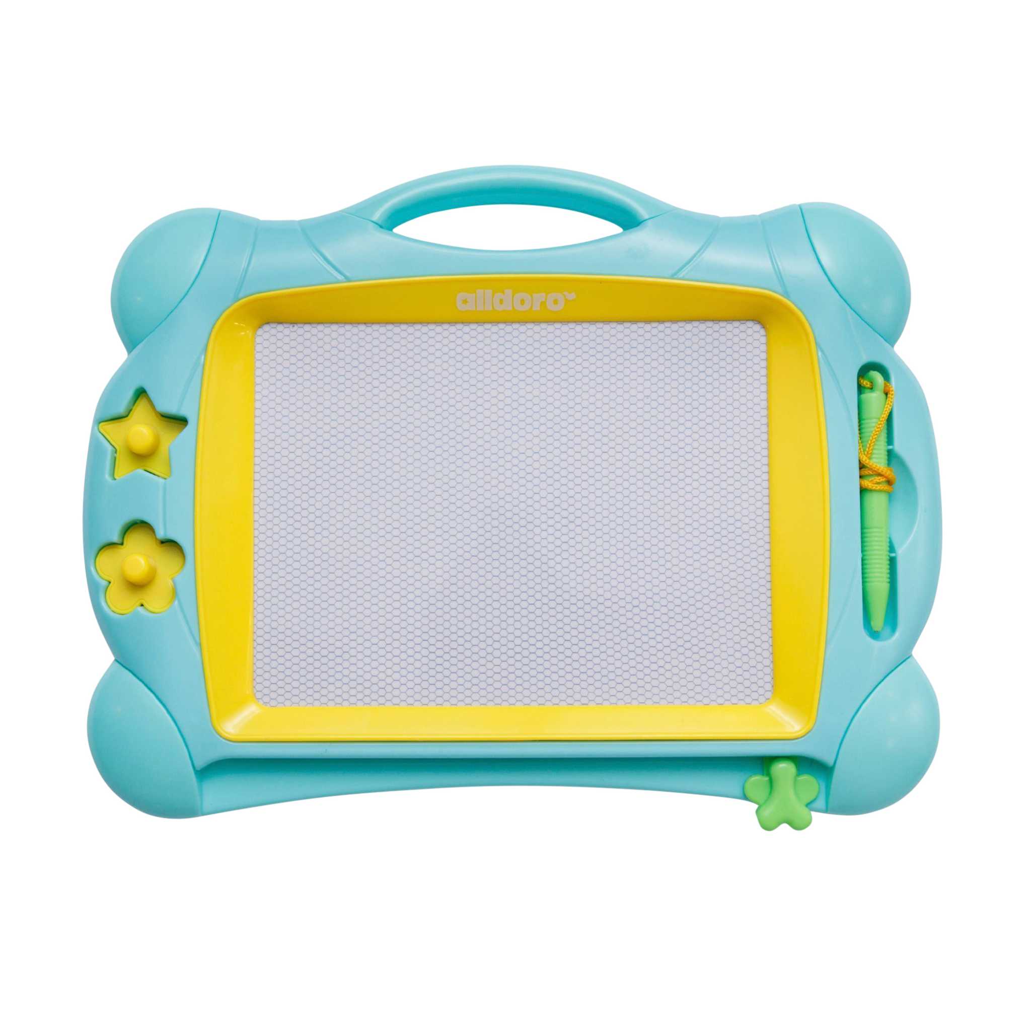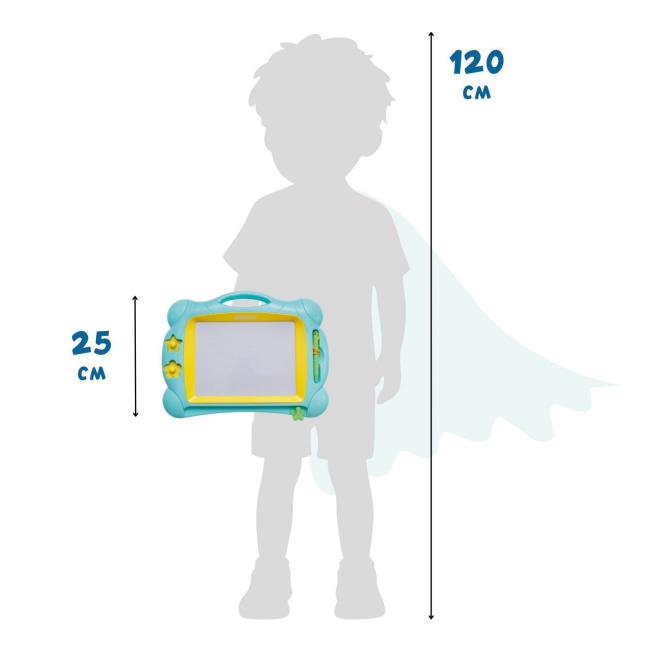Papierlos malen, spurenlos neu starten. Die magnetische Tafel lädt zu endlosem Malspaß ein: Kinder zeichnen auf dem großzügigen weißen Malbereich mit dem Stift, stempeln Sterne und Blumen, wischen alles weg und starten sofort die nächste Idee. Einfach den Schieber betätigen und das Bild verschwindet wie von Zauberhand. Ideal für Sitzkreis, Kreativstation und die ruhige Ecke. Im Vorschulalter trainieren Kinder dabei Stiftführung, Form- und Buchstabenerkennung sowie Feinmotorik. Ab 3 Jahren.