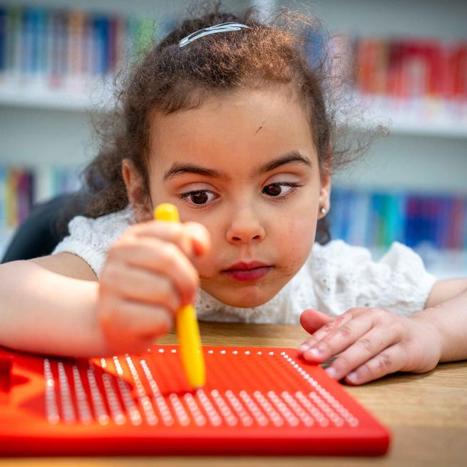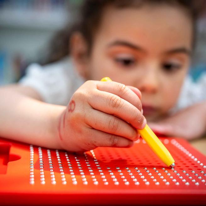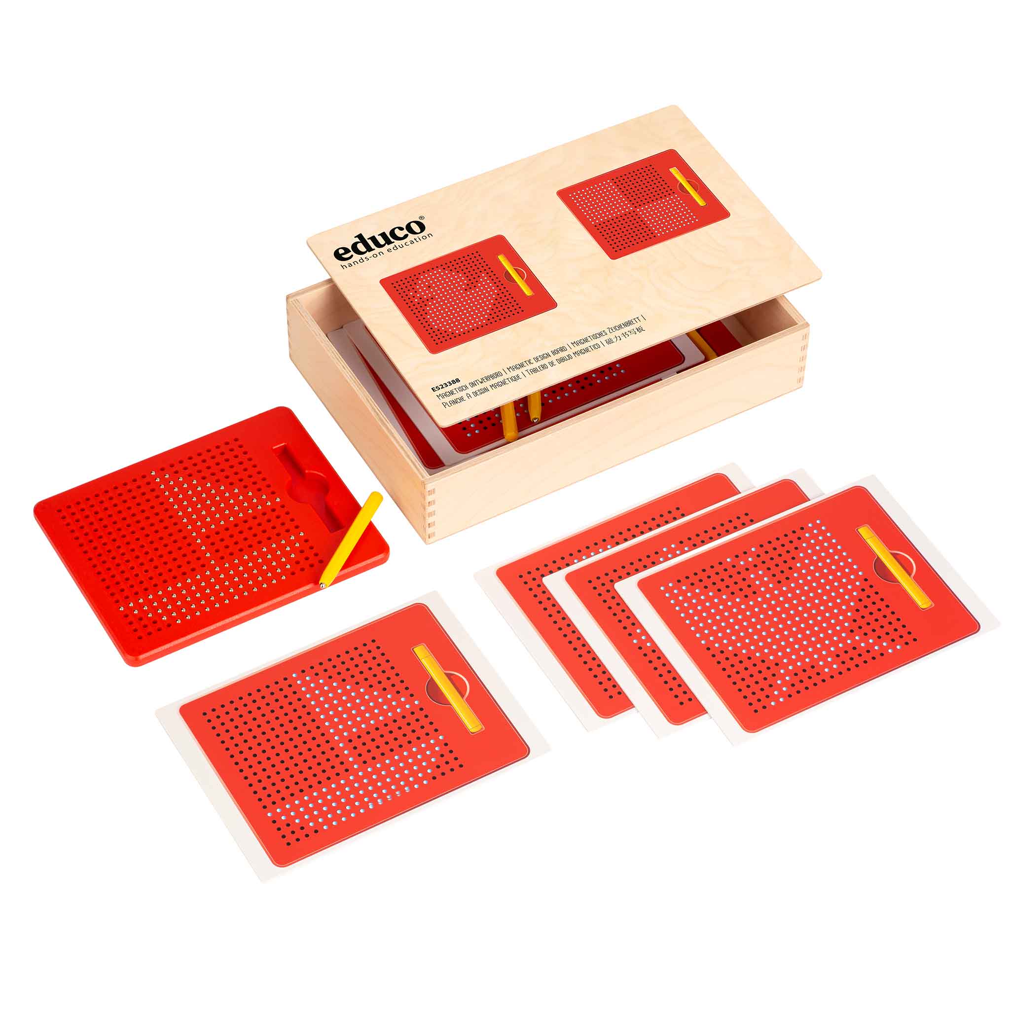 Hier entdecken die Kinder die faszinierende Welt des Magnetismus. Das Spiel ist nicht nur unterhaltsam, sondern fördert auch die feinmotorischen Fertigkeiten, visuelle Differenzierung und Konzentration von Kindern. Die Kinder können stundenlang mit den Aufgabenkarten experimentieren und sogar ihre eigenen Designs erstellen. Die Kugeln werden mit dem Magnetstift auf die Brettchen gesetzt und können mit den Fingern einfach wieder entfernt werden. A 3 Jahren.