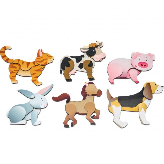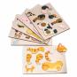 Jede Aufbewahrungsbox enthält 6 Motive zu den Themen Transport, Vögel, Wild-, Bauernhof- oder Meerestiere. Die magnetischen Einzelteile befinden sich jeweils auf einer Holzplatte in entsprechend konturierten Vertiefungen. Als Orientierungshilfe ist das fertige Motiv auf jedem Brett abgebildet. Alle Teile sind beidseitig in 2 unterschiedlichen Farben bedruckt. Wer puzzelt die magnetischen Teile so zusammen, dass das fertige Motiv entsteht?