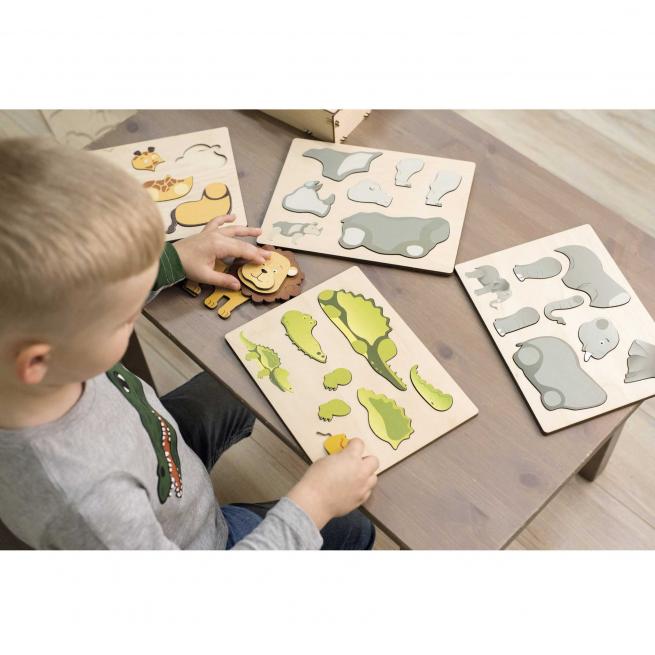 Jede Aufbewahrungsbox enthält 6 Motive zu den Themen Transport, Vögel, Wild-, Bauernhof- oder Meerestiere. Die magnetischen Einzelteile befinden sich jeweils auf einer Holzplatte in entsprechend konturierten Vertiefungen. Als Orientierungshilfe ist das fertige Motiv auf jedem Brett abgebildet. Alle Teile sind beidseitig in 2 unterschiedlichen Farben bedruckt. Wer puzzelt die magnetischen Teile so zusammen, dass das fertige Motiv entsteht?
