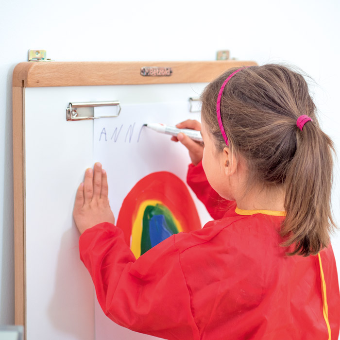 Das Multitalent: Im Nu wechseln Sie die Oberfläche. Zur Verfügung stehen Ihnen eine magnetische, schwarze Tafeloberfläche oder ein Whiteboard. Die Whiteboardtafel wird einfach durch die Schiebeleiste eingeschoben. Papier befestigen Sie an den beiden Klemmen. Zu der Malwand gehört ein abnehmbares Farbtablett mit 4 Farbtöpfen, aus Kunststoff. Mit Metallaufhängung.