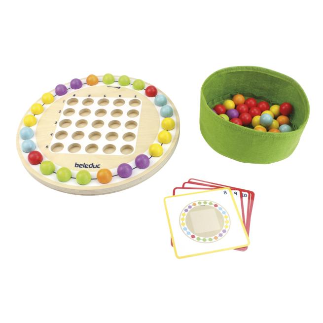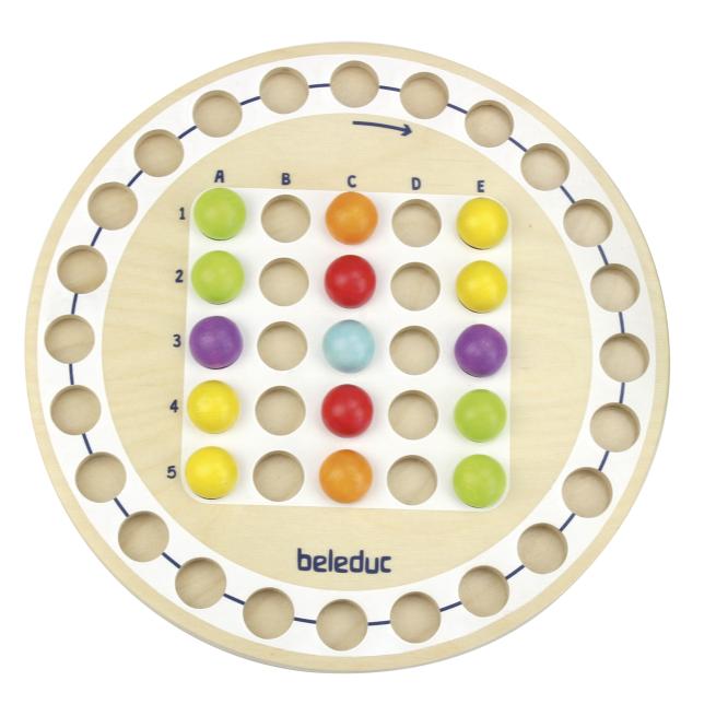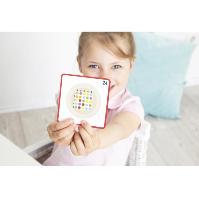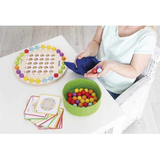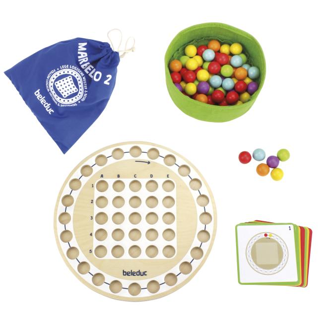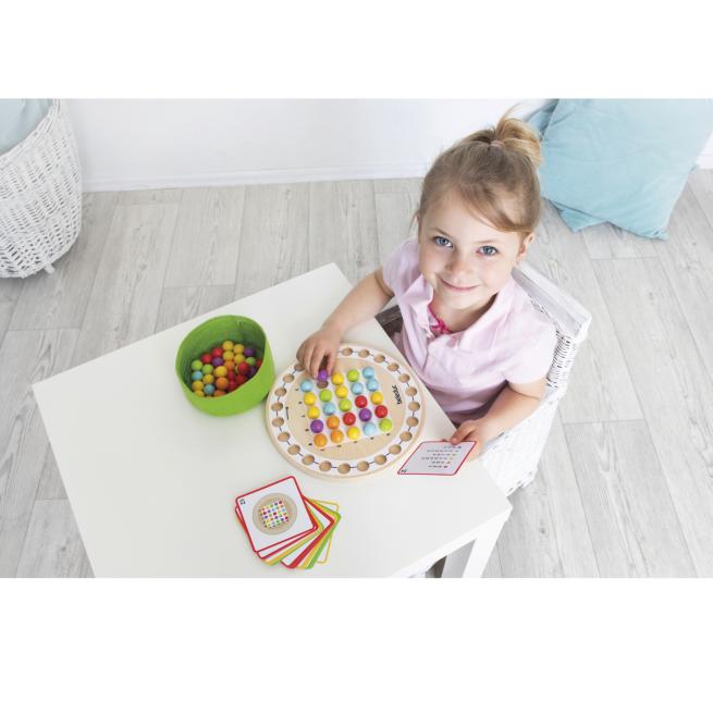 So läuft das Lernen rund: Mit dem abwechslungsreichen Sortier- und Legespiel Marbelino Pattern üben Kinder ab 4 Jahren, Muster zu erkennen und auf dem Spielbrett nachzulegen. Hierzu platzieren sie die bunten Holzmurmeln so in den Vertiefungen des Außenkreises oder des quadratischen Innenfelds, dass sie als Ergebnis das abgebildete Muster der Aufgabenkarten erhalten. Das Spiel ist einzeln oder zu zweit spielbar und besitzt 3 Schwierigkeitsstufen. Das macht es für Kinder unterschiedlicher Altersgruppen und Lernstände geeignet. Verwenden Sie Marbelino Pattern auch für das Freispiel und lassen Sie die Kinder munter eigene Muster erfinden. Der vielseitige Umgang mit den Murmeln sowie das gezielte Positionieren in den Mulden fördern auf ansprechende Weise die kindliche Feinmotorik und schulen intensiv die Hand-Auge-Koordination.