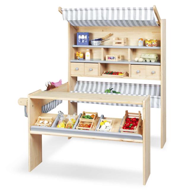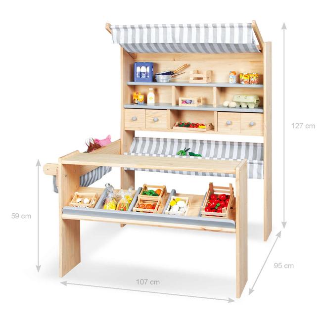 Am Marktstand Lucy bieten kleine Kaufleute ihren Kundinnen und Kunden ein herrliches Einkaufserlebnis. In den 4 Schubladen und den zahlreichen Fächern sowie Ablagen bietet der Stand jede Menge Platz für alles, was Einkauffans dringend brauchen. Der Marktstand ist besonders standfest. Zudem können Sie ihn flexibel aufstellen, denn der seitliche Tresen ist wahlweise rechts oder links montierbar. Sein unbehandeltes und lackiertes Kiefernholz sowie die klassischen Streifen im Stoffdach und den beiden Auslagen verleihen dem Marktstand ein heimeliges Ambiente. Die Schubladenknöpfe, die beiden mittigen Fachböden und die vordere Auslage sind jeweils entsprechend der jeweiligen Streifenfarbe entweder rot oder grau. Zur einfachen Selbstmontage.