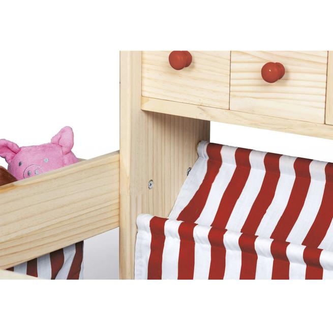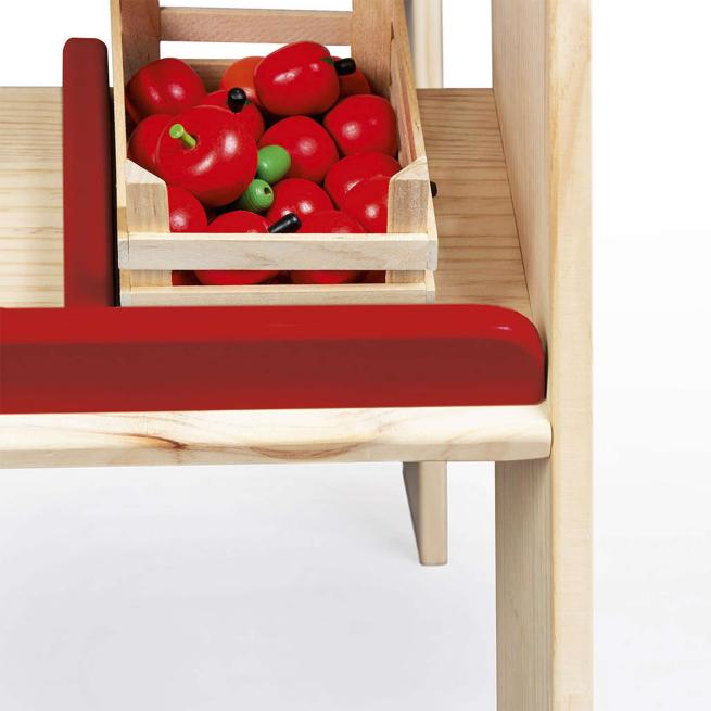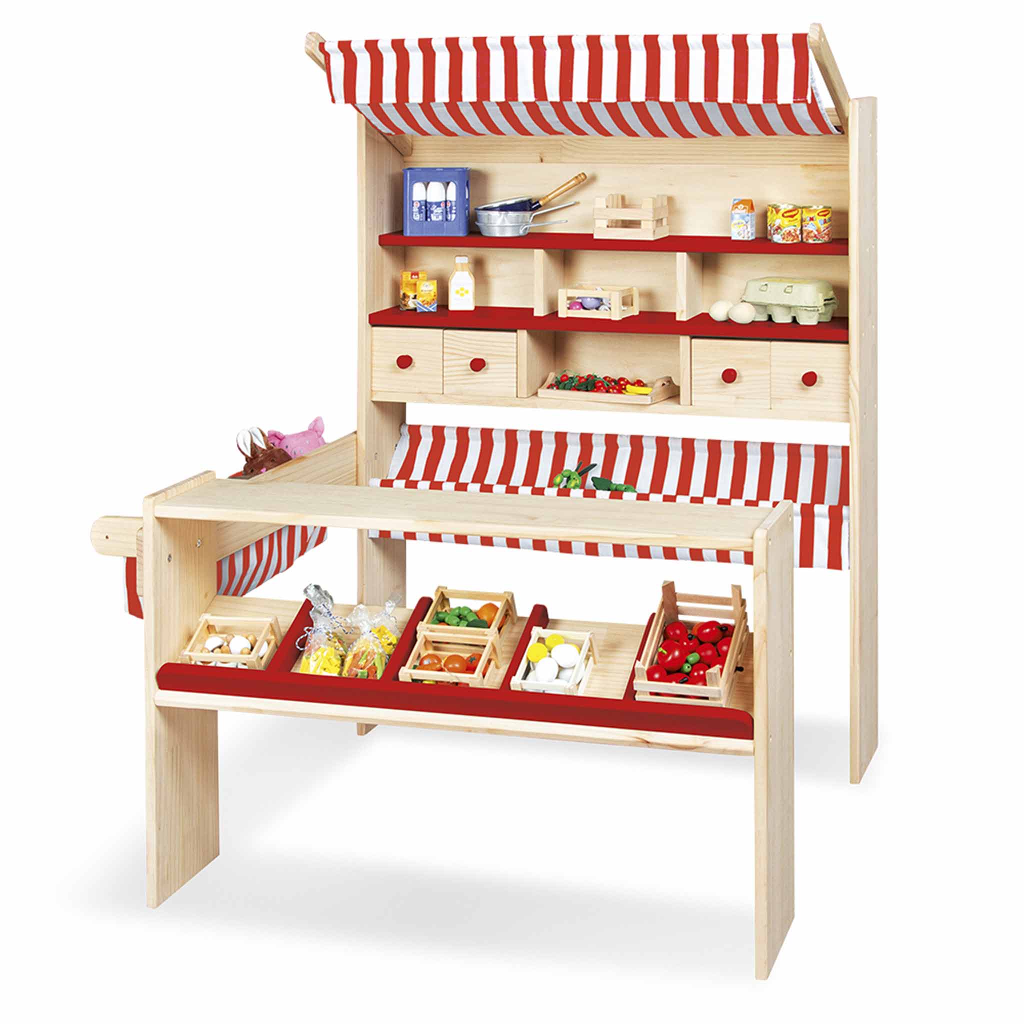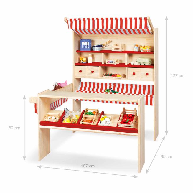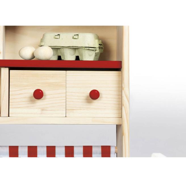 Am Marktstand Lucy bieten kleine Kaufleute ihren Kundinnen und Kunden ein herrliches Einkaufserlebnis. In den 4 Schubladen und den zahlreichen Fächern sowie Ablagen bietet der Stand jede Menge Platz für alles, was Einkauffans dringend brauchen. Der Marktstand ist besonders standfest. Zudem können Sie ihn flexibel aufstellen, denn der seitliche Tresen ist wahlweise rechts oder links montierbar. Sein unbehandeltes und lackiertes Kiefernholz sowie die klassischen Streifen im Stoffdach und den beiden Auslagen verleihen dem Marktstand ein heimeliges Ambiente. Die Schubladenknöpfe, die beiden mittigen Fachböden und die vordere Auslage sind jeweils entsprechend der jeweiligen Streifenfarbe entweder rot oder grau. Zur einfachen Selbstmontage.