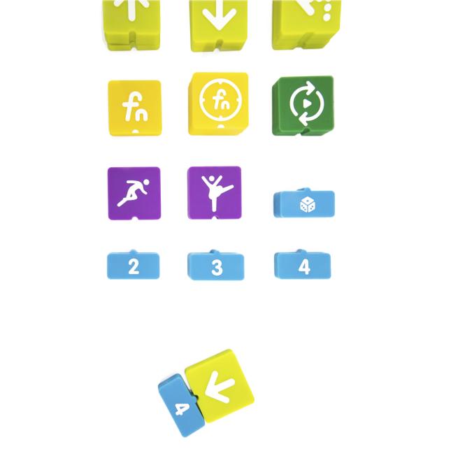 Das Programmieren des Roboters funktioniert kinderleicht über Bausteine. Darauf sind eindeutige Befehle gedruckt wie zum Beispiel geradeaus, 90° rechts, Programmschleife Start / Ende etc. Die Kinder legen die Bausteine einfach auf das Programmierboard. Auf Knopfdruck fotografiert die Kamera im Steuerturm die Bausteine auf dem Board und sendet die Befehle an den kleinen Roboter. Ist alles richtig gemacht, fährt der Roboter zum Ziel.