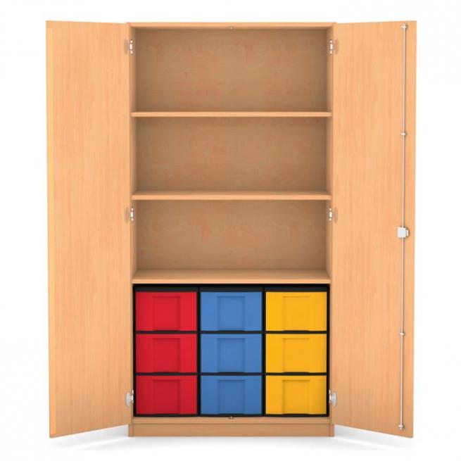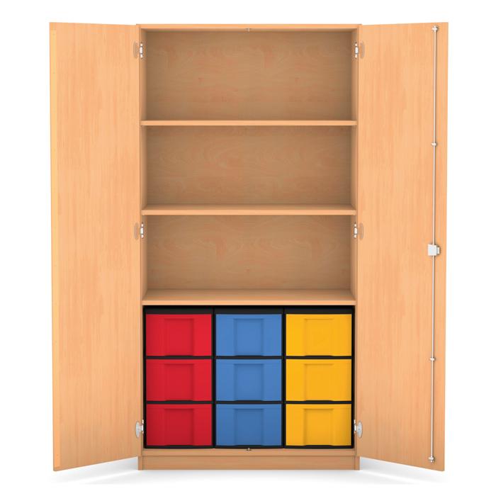 Materialschrank mit 9 hohen Boxen und 3 Böden, davon sind 2 verstellbar.
