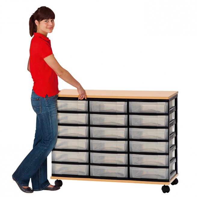 Wählen Sie aus unserem Boxensystem die für Ihre Einrichtung optimale Zusammenstellung. Die Schränke sind stabil und bieten jede Menge Platz. Die Schubladen haben eine Auszugssperre, damit sie nur bis zum sicheren Haltepunkt herausgezogen werden. Schnell und einfach nehmen Sie die Boxen auf Wunsch auch komplett aus der Führung. Zum Beispiel, wenn Sie einer Gruppe den kompletten Inhalt der Box zur Verfügung stellen wollen. Boxen aus Kunststoff, Schrankboden und -deckel aus Holz, melaminbeschichtet.