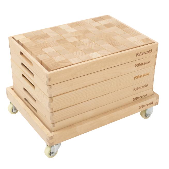 1 Bausteinwagen (rollbar) mit 5 Laden:1. Lade: Quader und Würfel aus Holz