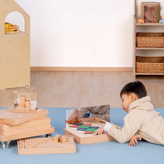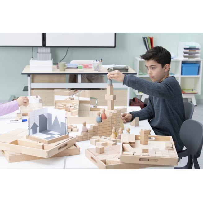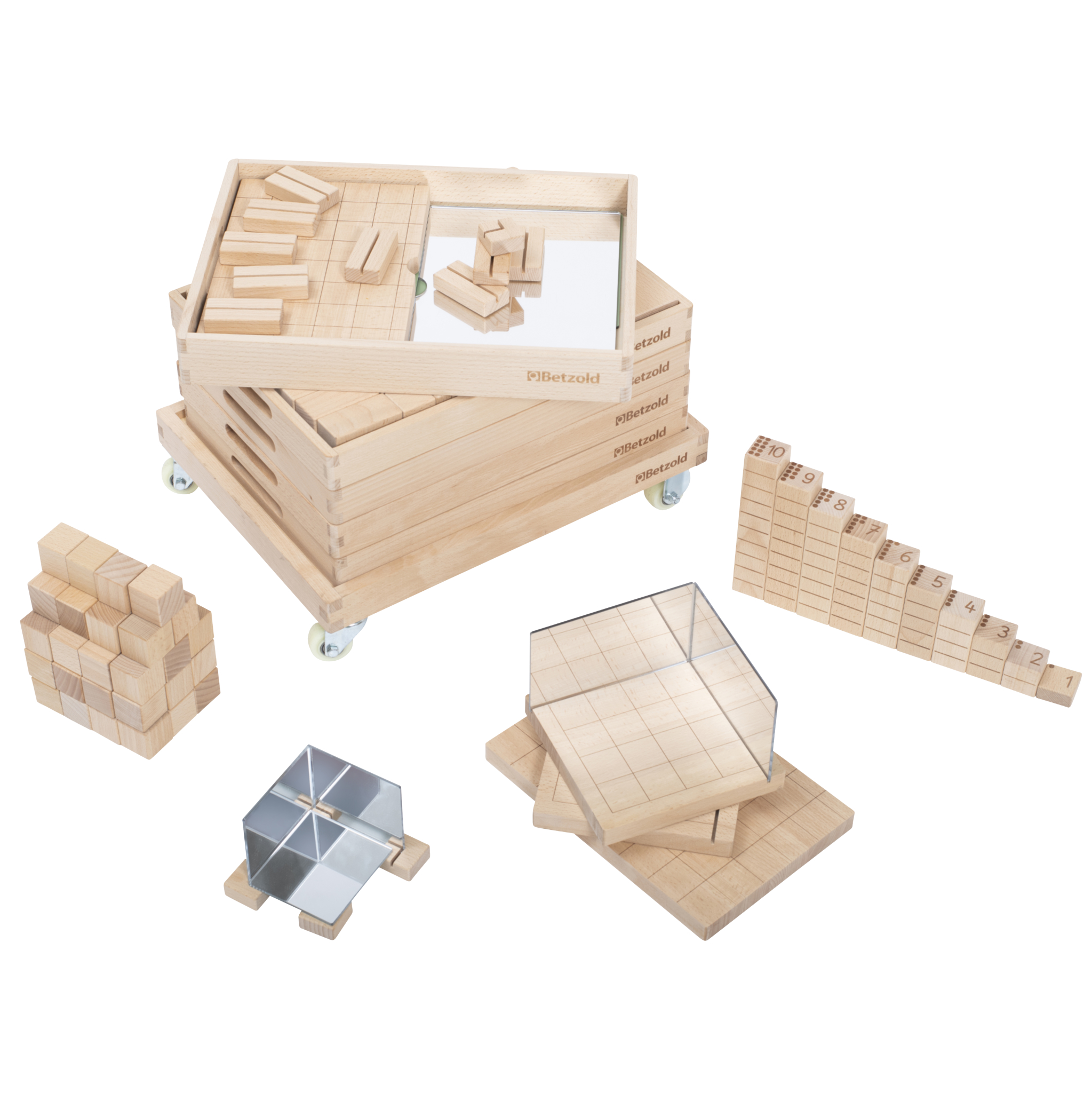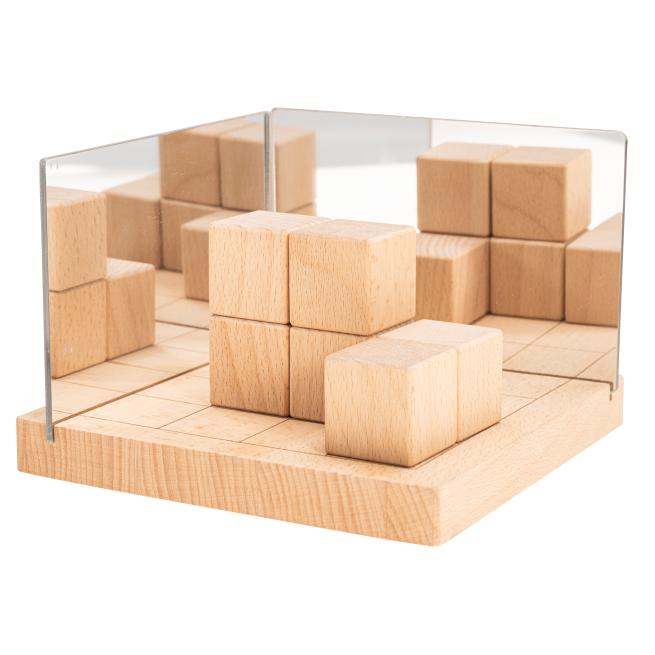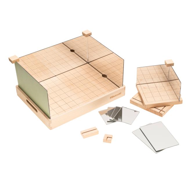 Die Kids tauchen schrittweise und altersgerecht in die Welt der Zahlen und Geometrie ein: Hölzerne Würfel, Quader, Dreiecksformen (Prismen), Zahlenbausteine und auf genuteten Holzunterlagen fixierbare Spiegel laden zu allerhand interessanten und abwechslungsreichen Experimenten und Übungen ein. Durch das intuitive Kombinieren der Bausteine und das Konstruieren von unterschiedlichen Bauwerken – Häuschen, Türmen, Brücken, Tunneln – erfahren und durchdringen die Kinder wichtige mathematische Prinzipien. Sie lernen erste geometrische Körper kennen und entdecken durch praktisches und spielerisches Ausprobieren die Teilung geometrischer Figuren oder Grundlegendes zu Symmetrie und Statik. Auch die haptische Darstellung von Zahlen, Mengen und ihren Zerteilungen kommt dank der unterschiedlich großen Zahlenbausteine nicht zu kurz.