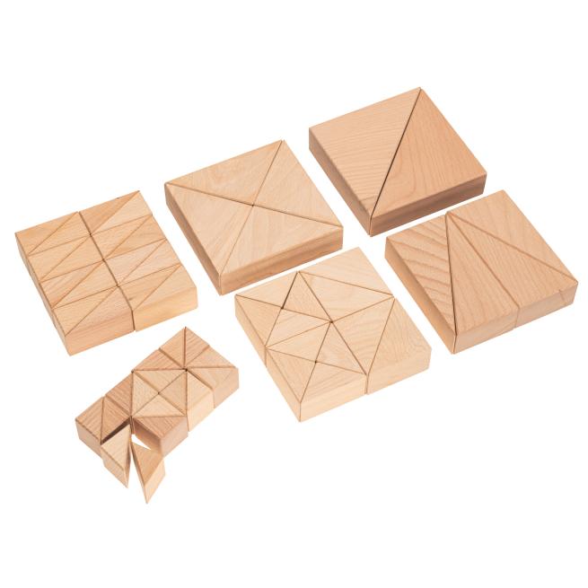 2. Lade: passende Dreiecksformen (dreiseitige Prismen) aus Holz (zur Veranschaulichung von Teilungen geometrischer Körper)
