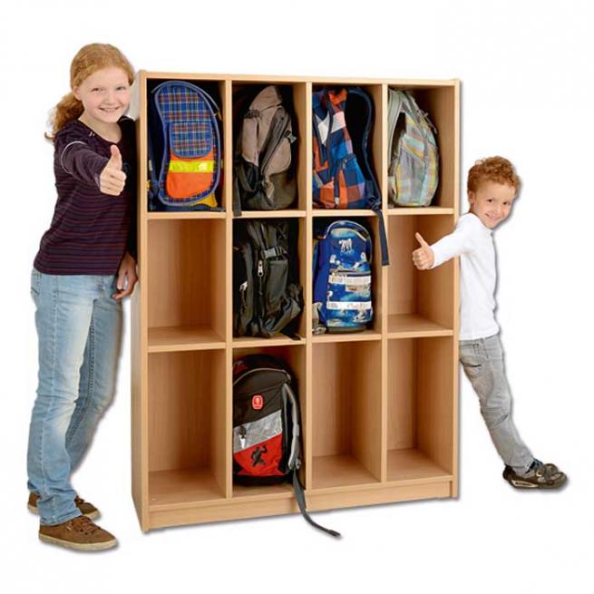 So schaffen Sie Ordnung unter den Schülertischen und im Gruppenraum. Jeder Ranzen hat seinen Platz. Das Regal ist melaminbeschichtet und feucht abwischbar. Die Bodenhöhen sind variabel. Platzsparende Bauweise mit 3 Regalfächern übereinander.