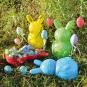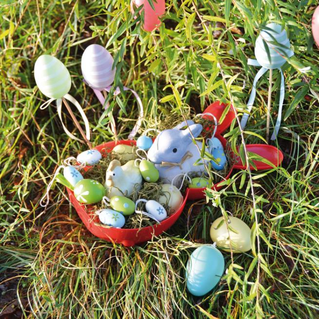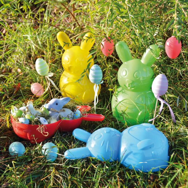 Erst Osternest für kleine Geschenke, dann Sandförmchen. Je 3x in Rot, Blau, Grün und Gelb.