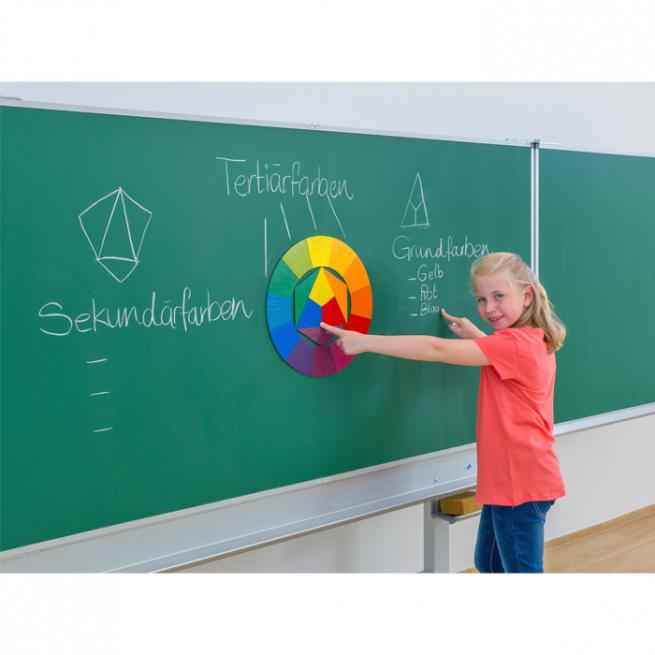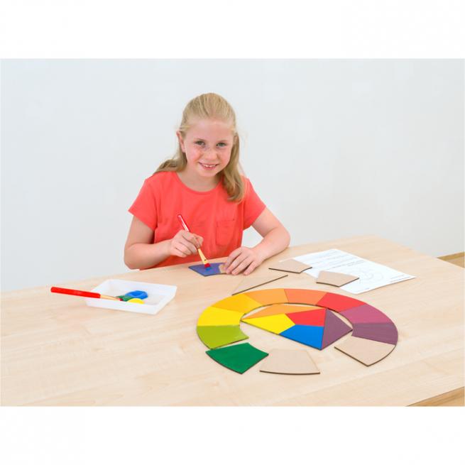 Rot, Gelb, Blau – eine gute Basis für 12 Farben. Dieser Farbkreis besteht aus 18 MDF-Teilen und hat einen Ø von 40 cm. Die einzelnen Puzzleteile sind 0,3 mm stark. Ausgehend von den drei Grundfarben Rot, Gelb, Blau, erschließen sich die Schüler den Farbkreis und die Farbbeziehungen untereinander selbst, indem sie die einzelnen Puzzleteile anmalen. Die Arbeitsblatt-Kopiervorlage enthält Ideen für den Unterricht und ist in Deutsch, Englisch und Französisch verfasst. Altersempfehlung: ab 7 Jahren