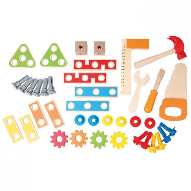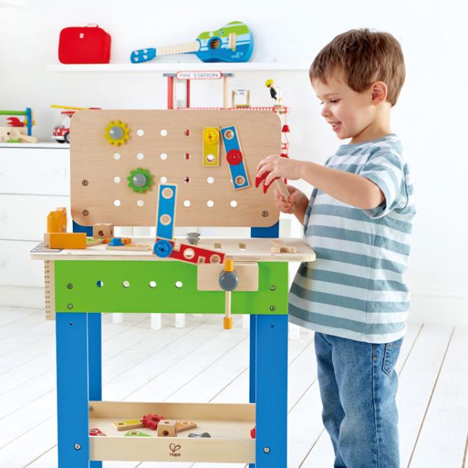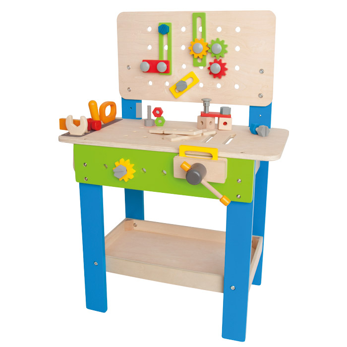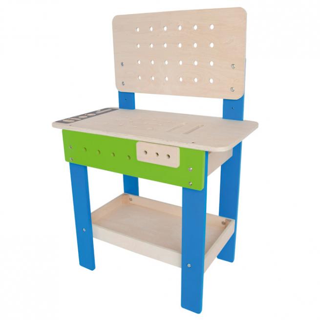 Wie die Profis hämmern, sägen, schrauben und bohren Ihre Kinder an der Meister-Werkbank. Die beiliegenden Werkzeuge und Handwerksutensilien stecken die Kleinen griffbereit in die dafür vorgesehenen Aussparungen. Auch der untere Regalboden mit Aufkantung dient als Lagerplatz. Ihren Wortschatz erweitern die Kinder spielerisch, indem Sie Ihnen die Werkzeuge und Utensilien erklären bzw. sie benennen.
