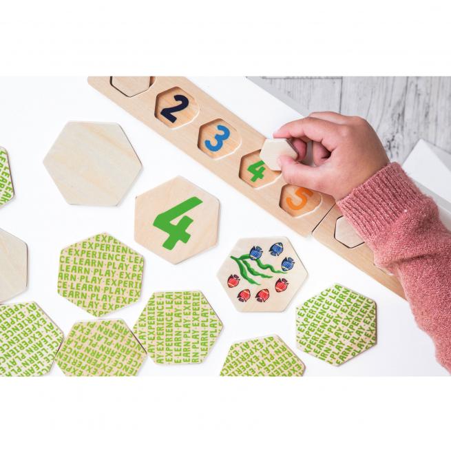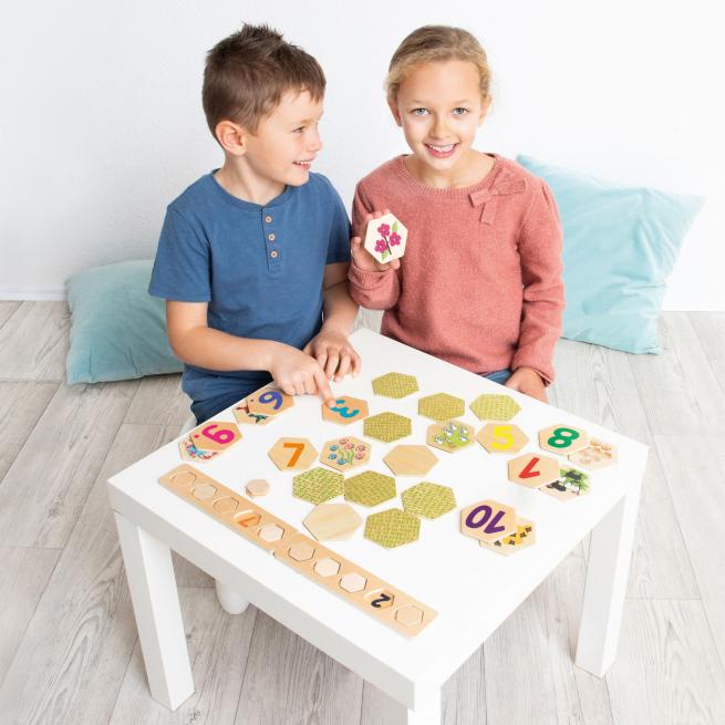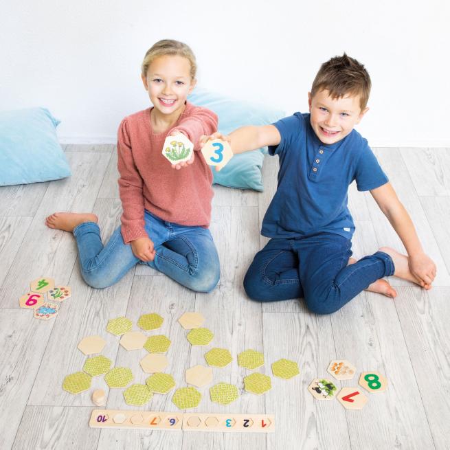 Dieses schöne Memory-Spiel im XL-Format ist komplett aus Holz. Es funktioniert ähnlich wie klassische Memo-Spiele. Wer an der Reihe ist, deckt eine Bildkarte und eine Zahlenkarte auf (anhand unterschiedlicher Rückseiten zu erkennen). Ist die passende Anzahl auf dem Bild zu finden, darf der Spieler die Karten behalten und deckt die vergebene Zahl auf dem Zahlenweg ab. Sind alle Zahlenfelder auf dem Zahlenweg verdeckt, endet das Spiel und es wird gezählt wer die meisten Karten gesammelt hat.
