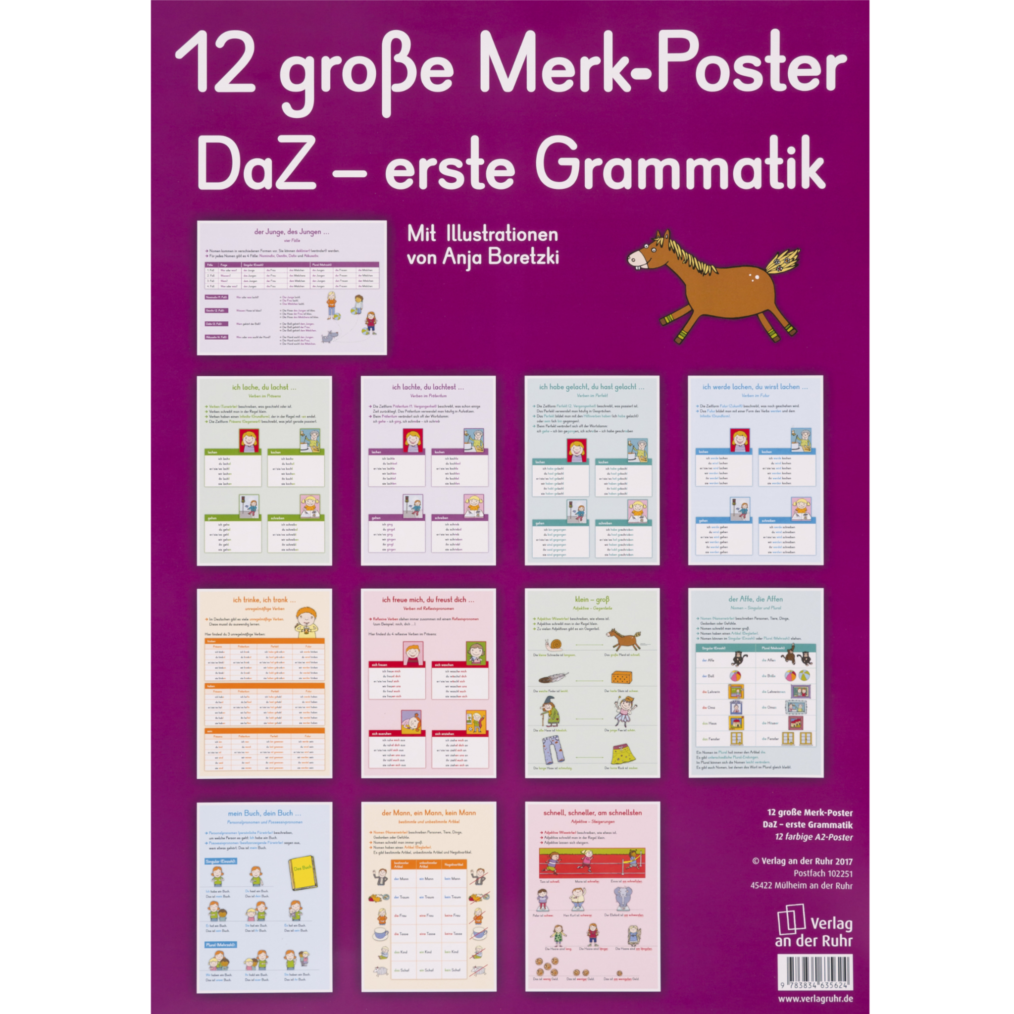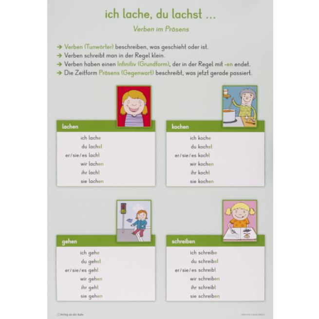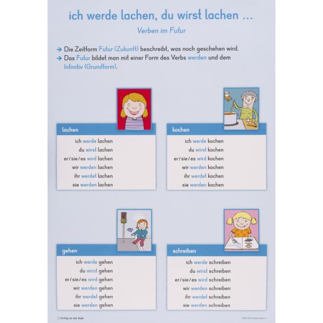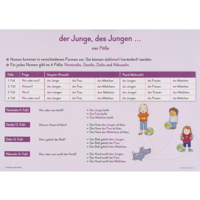 Anschauliche Eselsbrücke. Diese großen Poster sind für Deutschlerner jeder Jahrgangsstufe ein hilfreicher Hingucker. Ob Wortart, Zeitform oder Konjugation der deutschen Grammatik, vorgegebene Satzstrukturen für den täglichen Smalltalk oder Bild-Wort-Zuordnungen, die den Grundwortschatz festigen – witzige Illustrationen und leicht zu merkende Regeln helfen beim Lernen der fremden Sprache auf einen Blick.