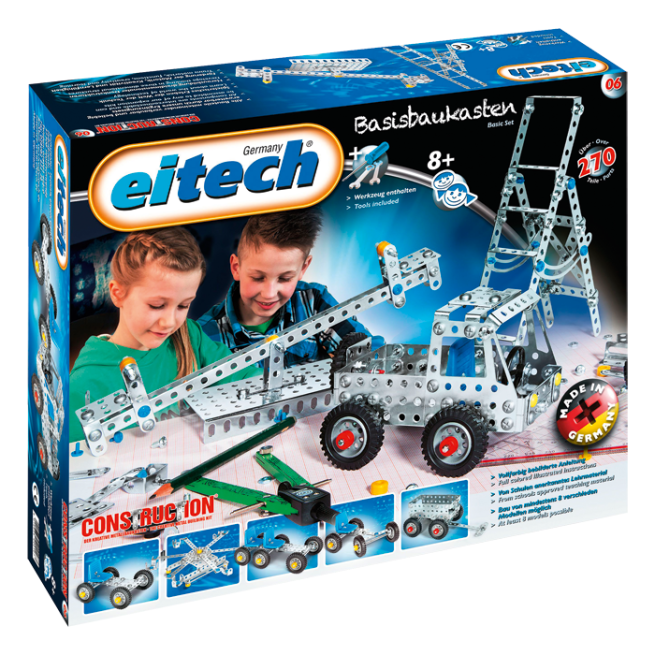 Material macht das Bauen Spaß. Aus den vielfältig verwendbaren Einzelteilen entstehen Konstruktionen, die sich sogar selbst bewegen. Die stabilen Teile lassen sich immer wieder verbauen. Die Bauanleitung zeigt Schritt für Schritt das Entstehen einfacher Grundmodelle. Natürlich sind der eigenen Fantasie keine Grenzen gesetzt. Die Metallbaukästen, made in Germany, eignen sich hervorragend für Team-Projekte rund um Technik und Mechanik.