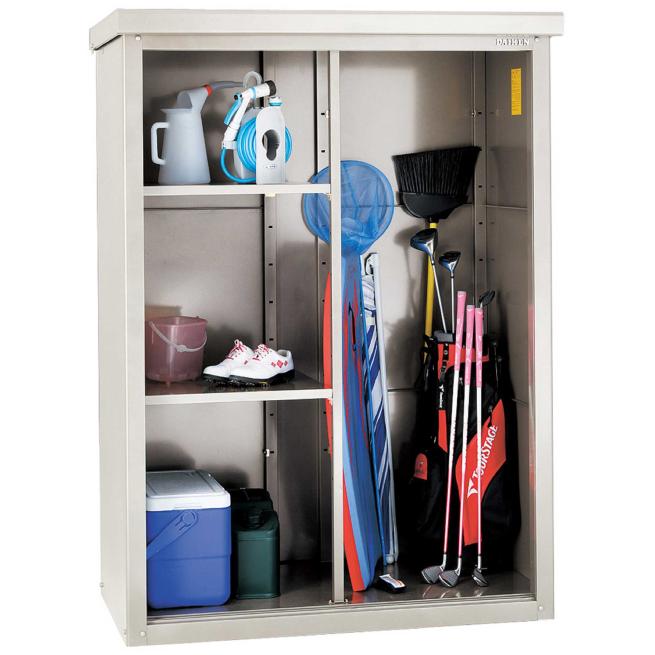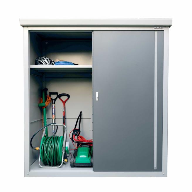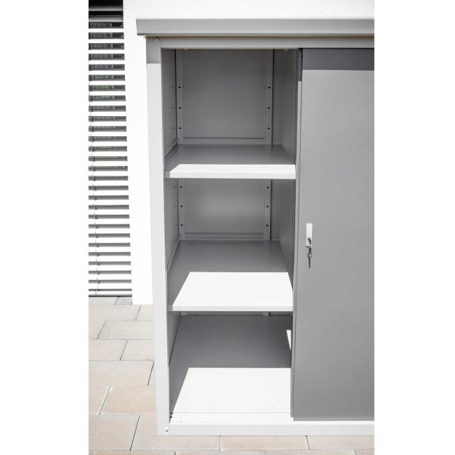 Der Guardian D63 ist kompakt konstruiert und verfügt über eine effektive Aufteilung des Innenraums. Die eine Schrankhälfte besitzt zwei stabile und höhenverstellbare Regalböden aus Metall mit einer jeweiligen Grundfläche von 84 x 77 cm (maximale Traglast: 55 kg/m²). Verwenden Sie die Regalflächen zum Lagern kleinerer bis mittelgroßer Utensilien, wie z. B. von Sandspielzeugen. Nutzen Sie demgegenüber die andere Schrankhälfte als geräumige Unterbringungsmöglichkeit zum Verstauen auch großer Gegenstände wie Keschern oder Besen. Mithilfe der praktischen Doppel-Schiebetür gelangen Sie schnell und einfach an alle im Schrank verwahrten Objekte. Die Tür ist mit einem eingebauten Zylinderschloss versehen und lässt sich verriegeln.
