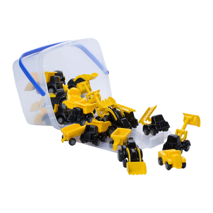 Ob Kipplaster, Bagger, Bulldozer, Leiterfahrzeug, Jeep oder Anhänger – dieses große Set mit 20 Fahrzeugen lässt im Sandkasten keine Baustellenfahrzeugwünsche offen. Im praktischen Eimer.