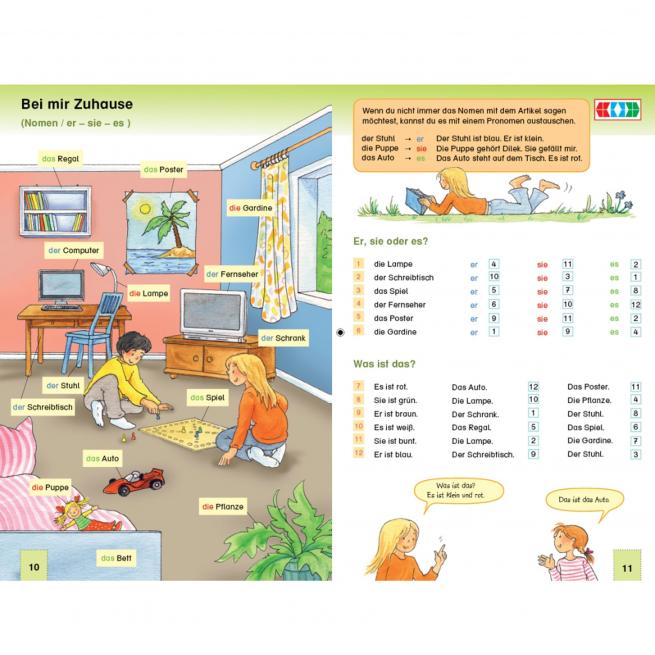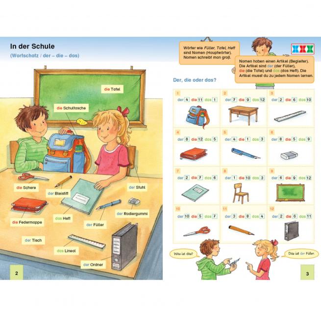 Bestandteile dieses Heftes sind die Artikel sowie der Gebrauch des Genitivs und Akkusativs, die anhand illustrierter Übungen gelernt werden können.
