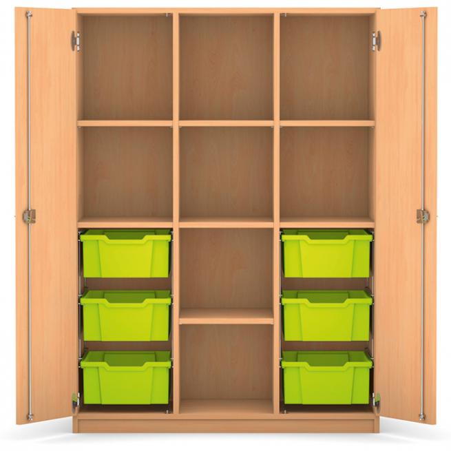 Funktionale Ordnung mit Übersicht. Mittelhohe Schränke mit Gratnells-Boxen, 2 Türen und einer offenen Reihe – diese praktischen Ordnungshelfer nutzen Sie dank der Sichtrückwand auch als Raumteiler. Teilen Sie kleine Bereiche ab und schaffen Sie so ganz neue Räume. Die Rückwand ist 8 mm stark und sorgt für gute Stabilität. Die Melaminharzbeschichtung hält den Belastungen des Schulalltags spielend stand. Verschmutzungen wischen Sie einfach feucht ab und die 2 mm starke ABS-Kante bietet Schutz vor Stößen und Feuchtigkeit, sodass Abnutzungserscheinungen verhindert werden. Dank der hochwertigen Markenbeschläge öffnen sich die Türen mit einem Öffnungswinkel von 270°. Für sicheres Verschließen über die gesamte Türhöhe sorgt die 3-Punkt-Verriegelung.