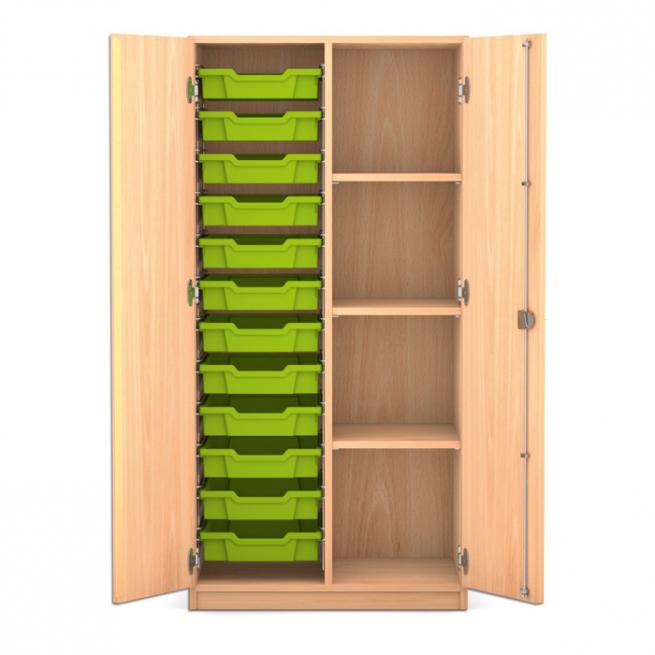 Schrank mit 12 flachen Boxen links und 3 verstellbaren Böden