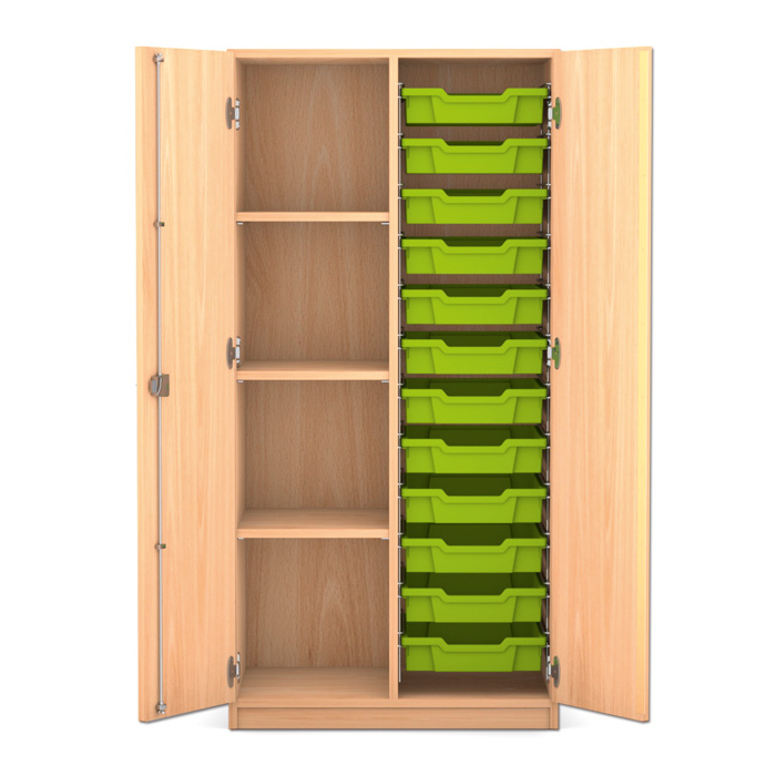 Schrank mit 12 flachen Boxen rechts und 3 verstellbaren Böden