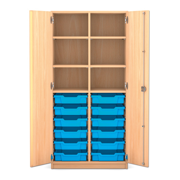 Schrank mit 12 flachen Boxen und 6 Fachböden, davon 4 verstellbar