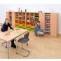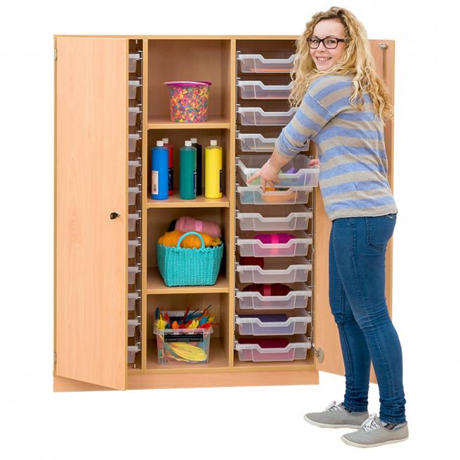 Funktionale Ordnung mit Übersicht. Mittelhohe Schränke mit Gratnells-Boxen, 2 Türen und einer offenen Reihe – diese praktischen Ordnungshelfer nutzen Sie dank der Sichtrückwand auch als Raumteiler. Teilen Sie kleine Bereiche ab und schaffen Sie so ganz neue Räume. Die Rückwand ist 8 mm stark und sorgt für gute Stabilität. Die Melaminharzbeschichtung hält den Belastungen des Schulalltags spielend stand. Verschmutzungen wischen Sie einfach feucht ab und die 2 mm starke ABS-Kante bietet Schutz vor Stößen und Feuchtigkeit, sodass Abnutzungserscheinungen verhindert werden. Dank der hochwertigen Markenbeschläge öffnen sich die Türen mit einem Öffnungswinkel von 270°. Für sicheres Verschließen über die gesamte Türhöhe sorgt die 3-Punkt-Verriegelung.